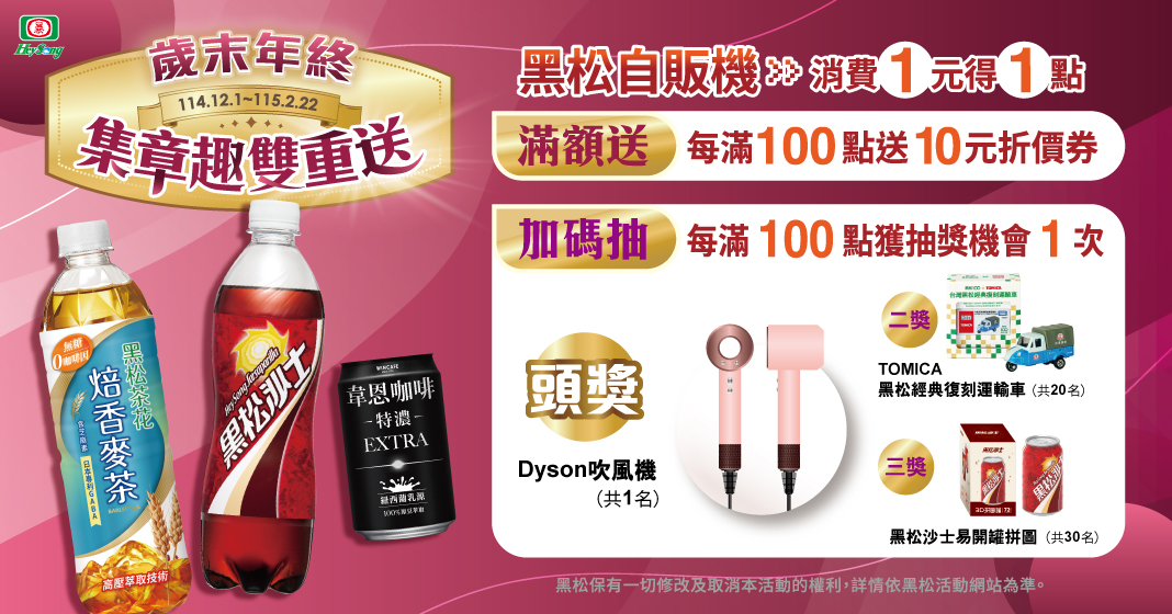 指定商品折價券使用期間限於2025年12月1日至2026年3月8日止,僅能於指定黑松智販機使用。
