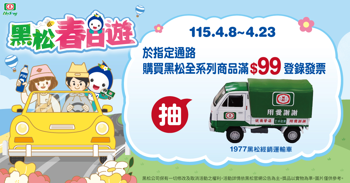 指定通路登錄發票抽:自2026/4/8 (三) 00:00 至 2026/4/23 (四) 23:59止,至「家樂福(含家樂福超市)」、「大全聯」、「愛買」實體門市購買黑松沙士/C&C/黑松茶花/FIN/韋恩咖啡任一品牌商品滿99元,於活動官網以LINE帳號綁定黑松會員,並登錄【購買發票號碼】即可抽1977黑松經銷運輸車,共50名。
