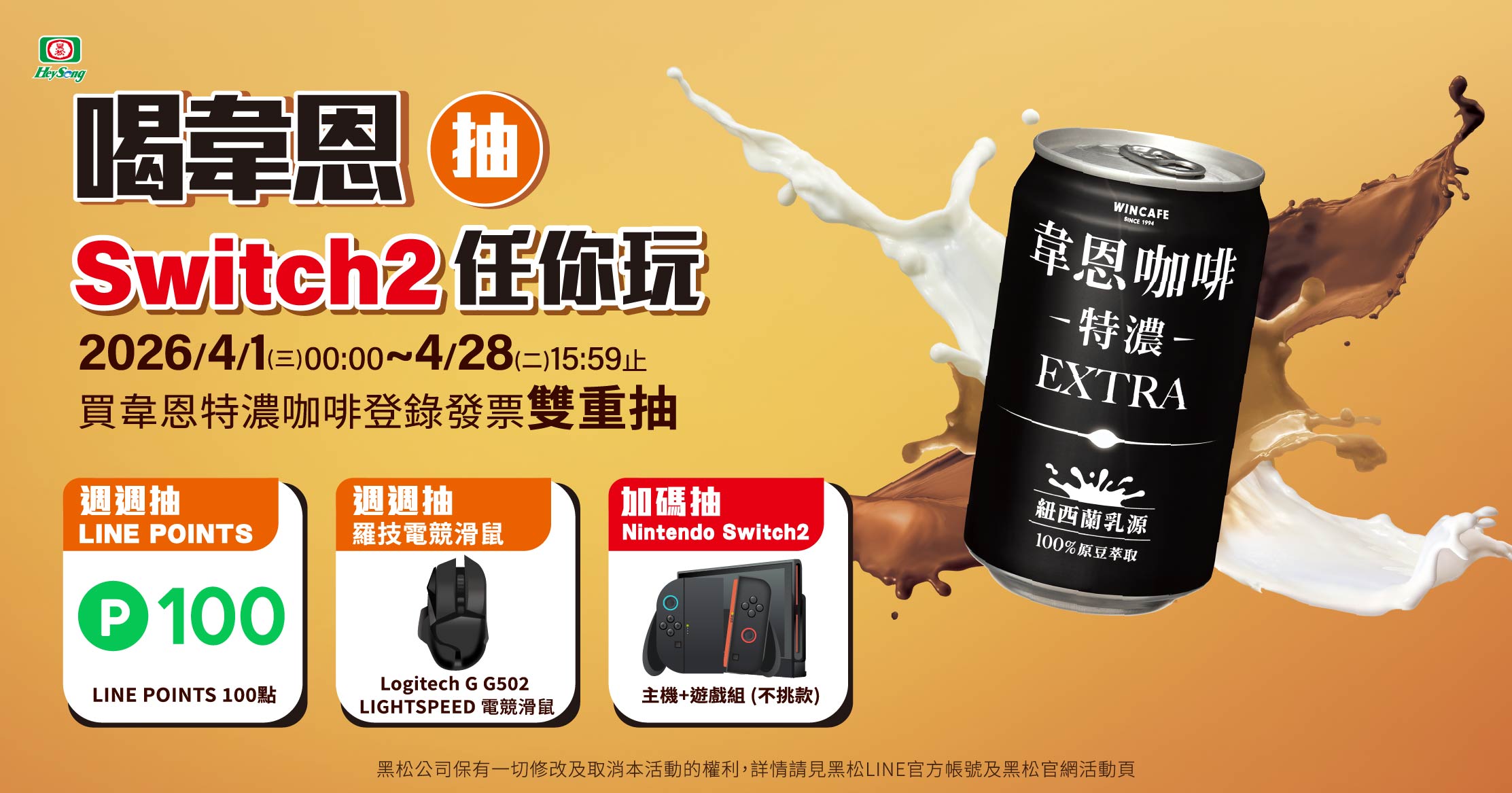 • 自2026/4/1 (三) 00:00 至 2026/4/28 (二) 15:59止,凡於全家便利商店實體門市購買CAN320mL韋恩特濃咖啡,於黑松活動官網以LINE帳號綁定黑松會員,並登錄購買發票號碼即可參加抽獎!週週抽LINE POINTS、Logitech G電競滑鼠,加碼再抽Nintendo Switch 2主機遊戲同捆組!